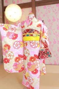 とっても可愛いピンク・赤の着物♪全体に柄があるので、お顔周りも華やかです!また、イマドキの大柄で目を引きます!帯や小物は、スタッフがその子に合わせてコーディネイトをしていきますが、ご希望があれば相談してみて下さいね♪