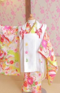 定番のピンクや赤も可愛いですが、白い被布が珍しい黄緑色のお着物がおすすめ♪甘すぎず、カジュアルな黄緑の着物がとっても可愛さしいですね♪3歳の衣装は、お母さん・お父さんが決めてあげることも多いので、大人にも大人気です☆