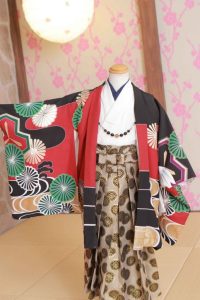 大柄の和モダンな柄が大人気!色味も赤と黒ではっきりとしていて、お写真移りもばっちりですね♪青や黒もかっこいいですが、このお着物が1番人気です♪