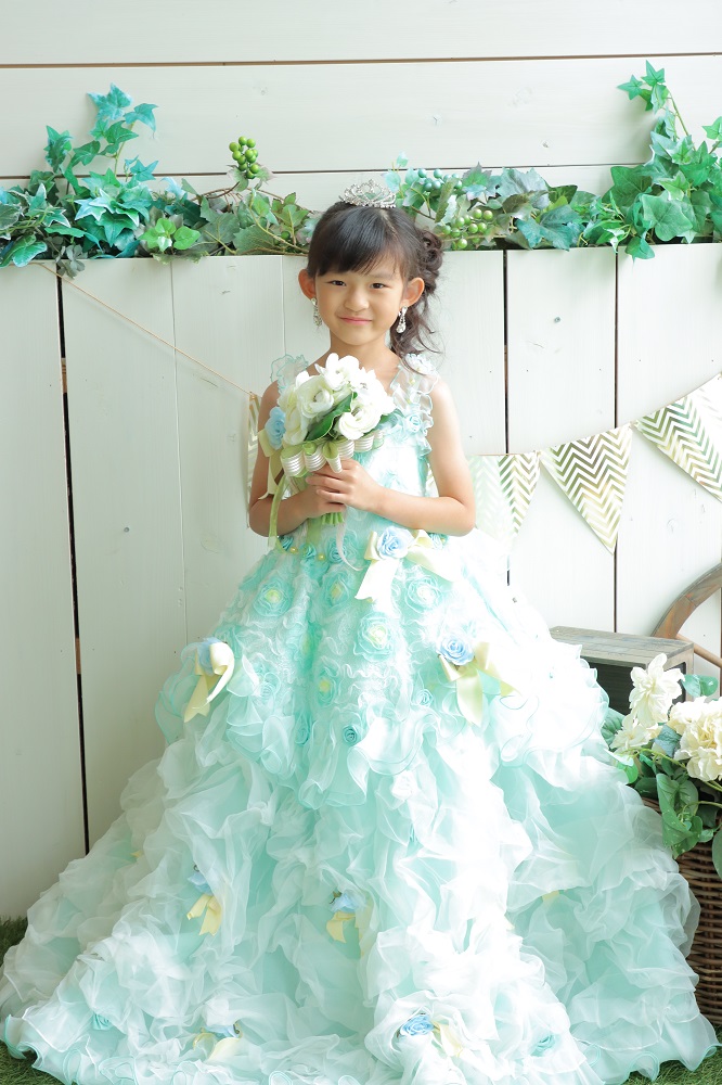 3歳さんではピンク系の可愛らしい衣装を着ることが多いですが、7歳さんは大人っぽく水色やエメラルドグリーンなど寒色系の落ち着いた色を選ぶ方がとても多いです!