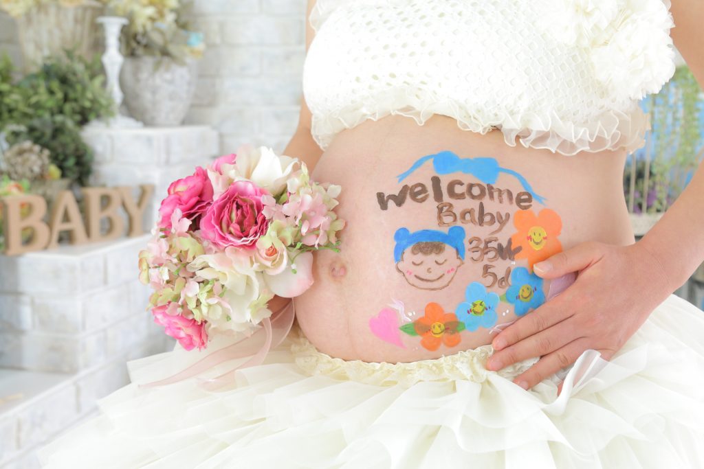 と安産祈願を込めて妊婦さんの大きなお腹に絵を描く新しい『おまじない』です♪