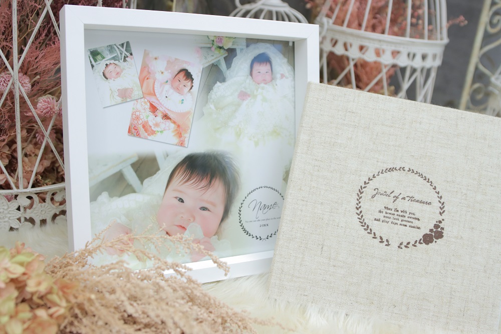 正方形のフレームと三面台紙付きの飾れるお写真。サイズ感が可愛いくて人気です♪不織布の肌触りの良い三面台紙を保存用、4カット写真が入るフレームは飾るようとお宮参りにぴったりなお写真ですね。カットデータ(7枚)もついているのでお得!!