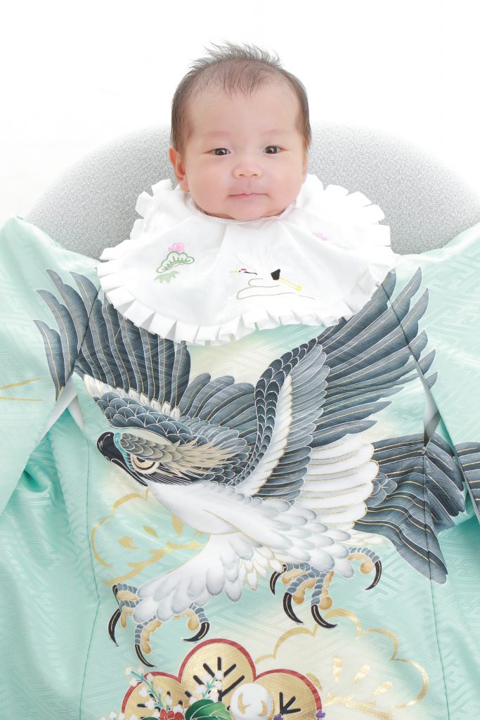 祝い着のデザインには男女で違いがあります。男の子は、鷹や兜、龍や虎など強くたくましいイメージ柄のものが人気で、女の子用には、蝶、手毬、鈴、御所車や鼓などの華やかで上品な柄がよく使われています。