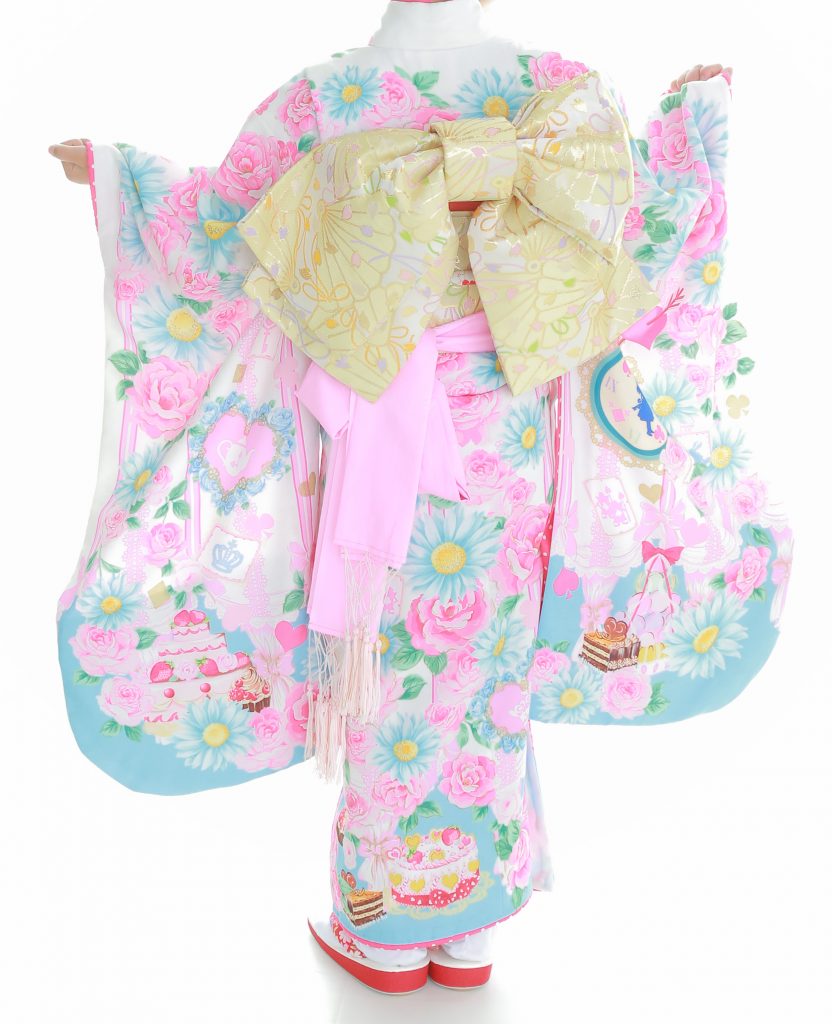 白地に大きくバラやカップケーキ、ハートなど、淡い色味がとってもかわいいお着物です♡