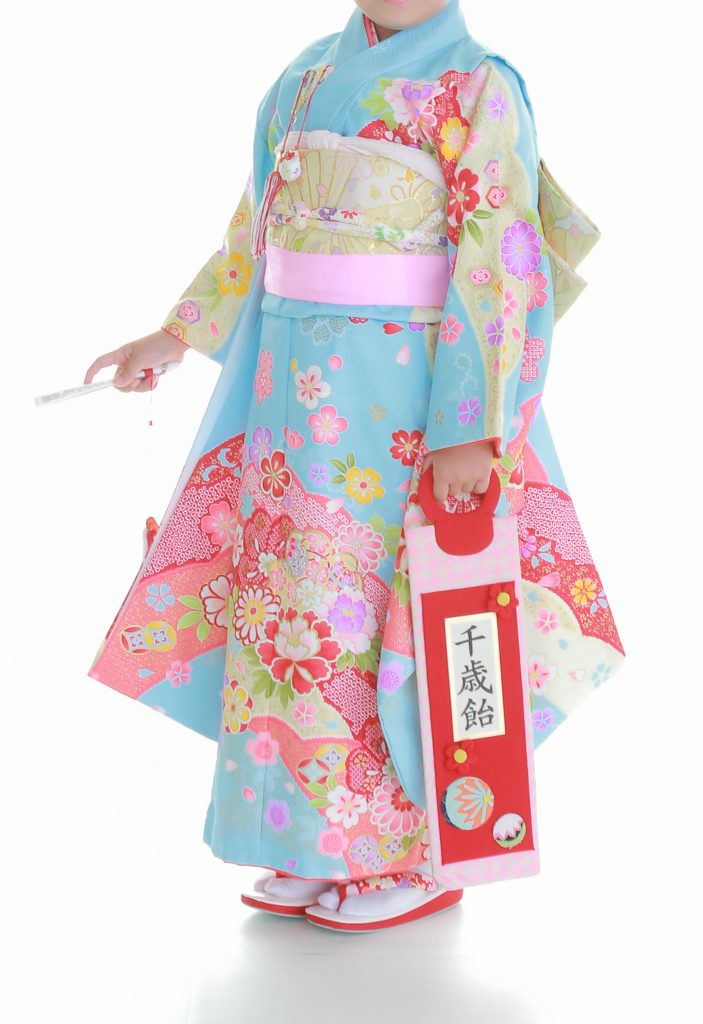 先ほどの王道系よりも、ピンクや水色、黄緑など明るく元気いっぱいなイメージのお着物です(*^。^*)