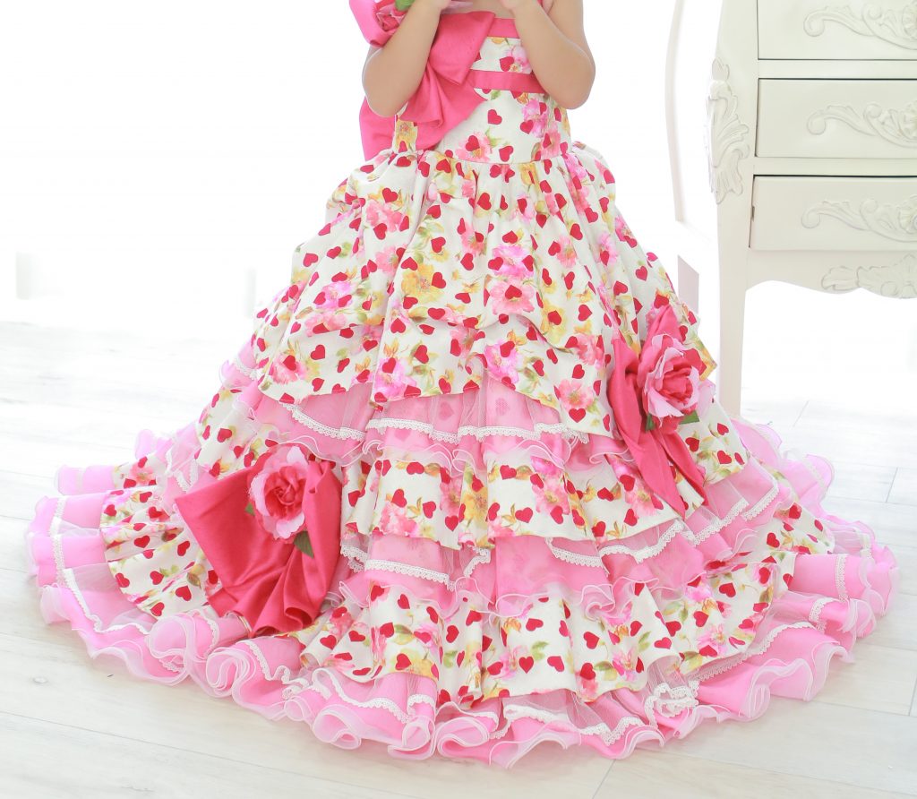 こちらのドレスは全体にハートが入っていて、女の子が大好きなピンクのフリフリがたっくさんの