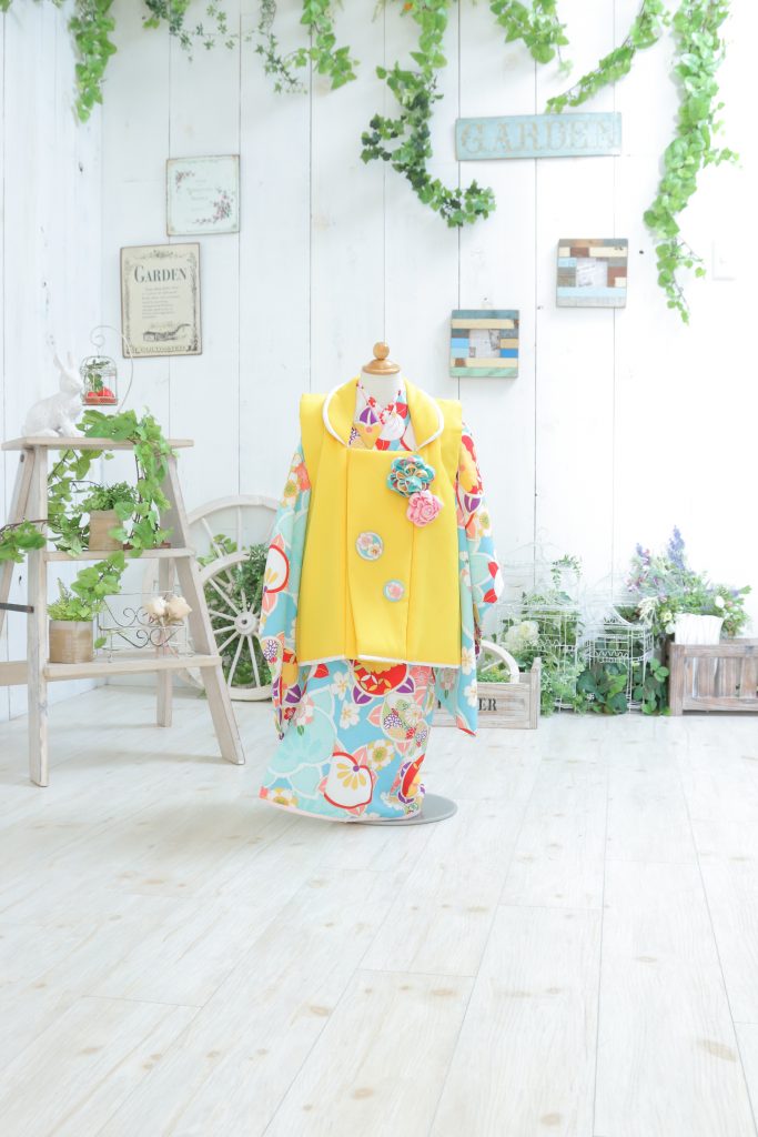 水色のお着物に黄色の被布が爽やかで可愛いお衣裳です♡