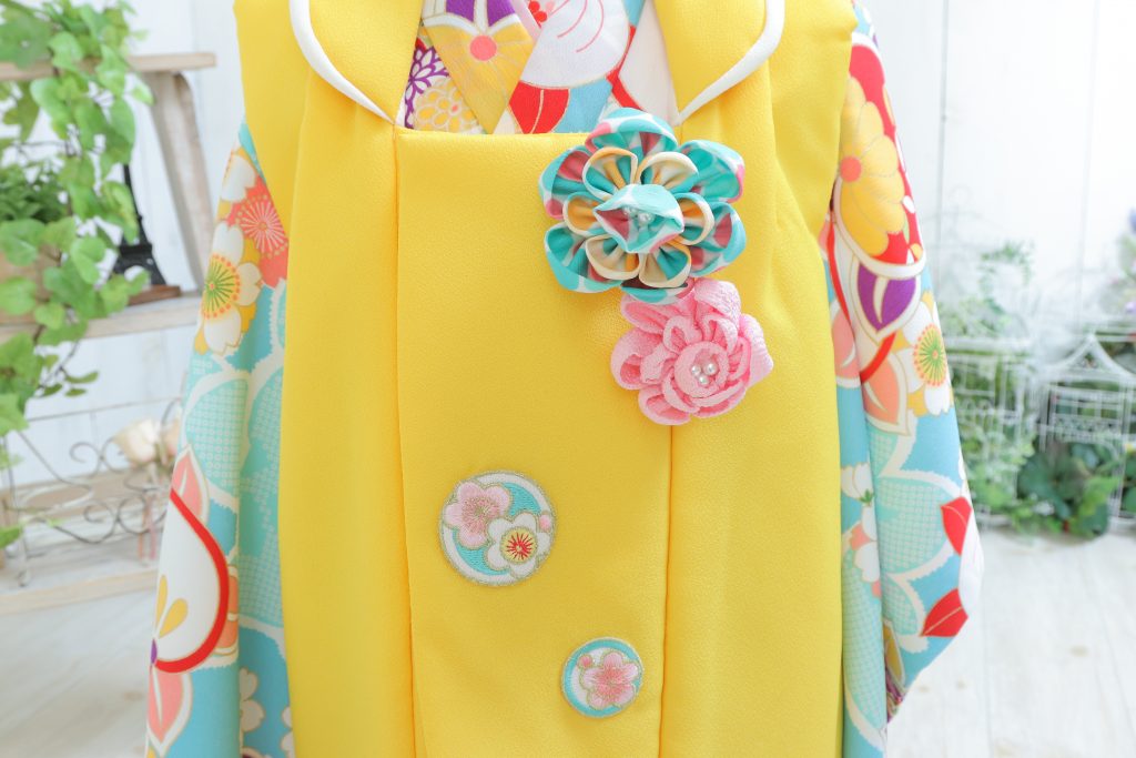 そして被布には、つまみ細工で作られた鮮やかな水色とピンクの大きなお花がアクセントになっています♪