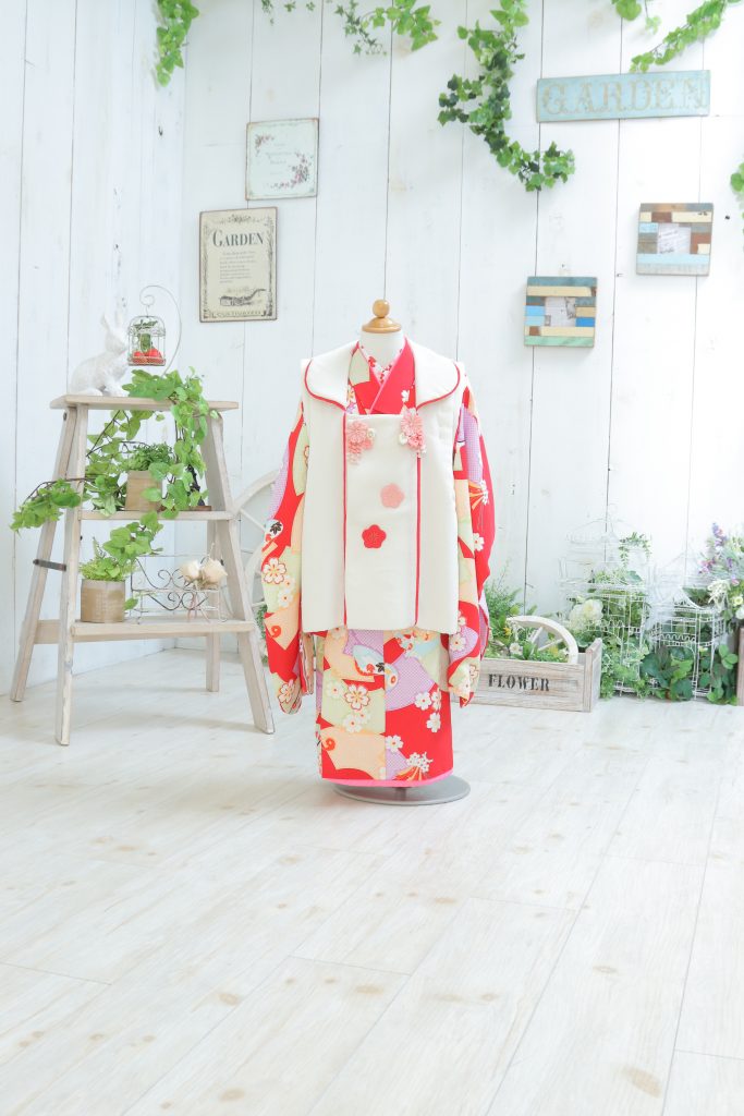 鮮やかな赤い着物とクリーム色の被布の組み合わせです☆