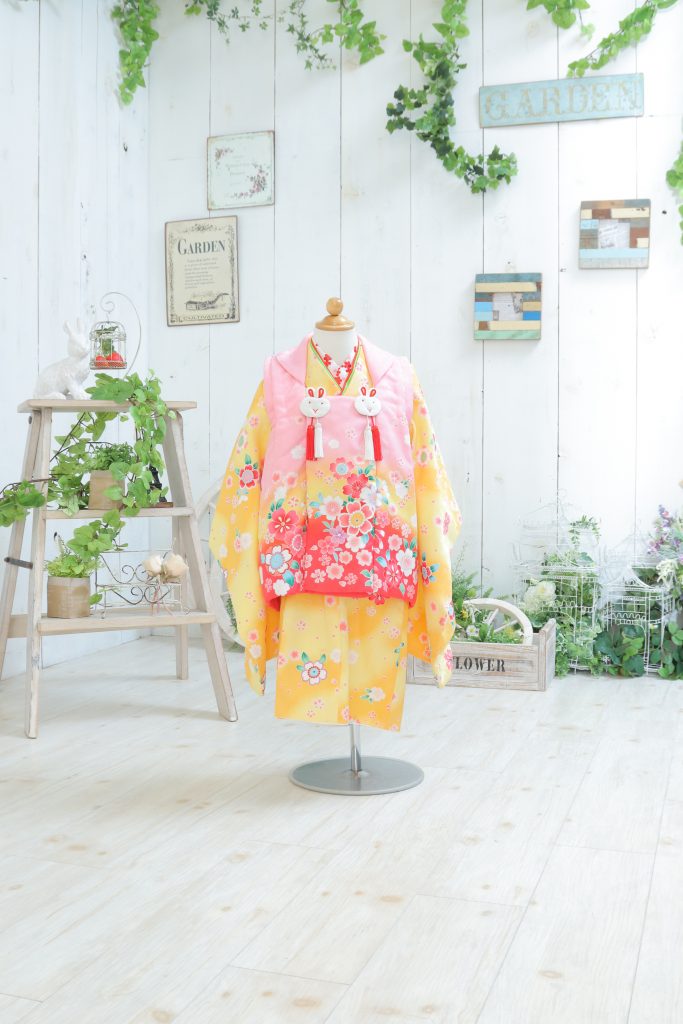 黄色のお着物にピンクの被布のお衣装です♪