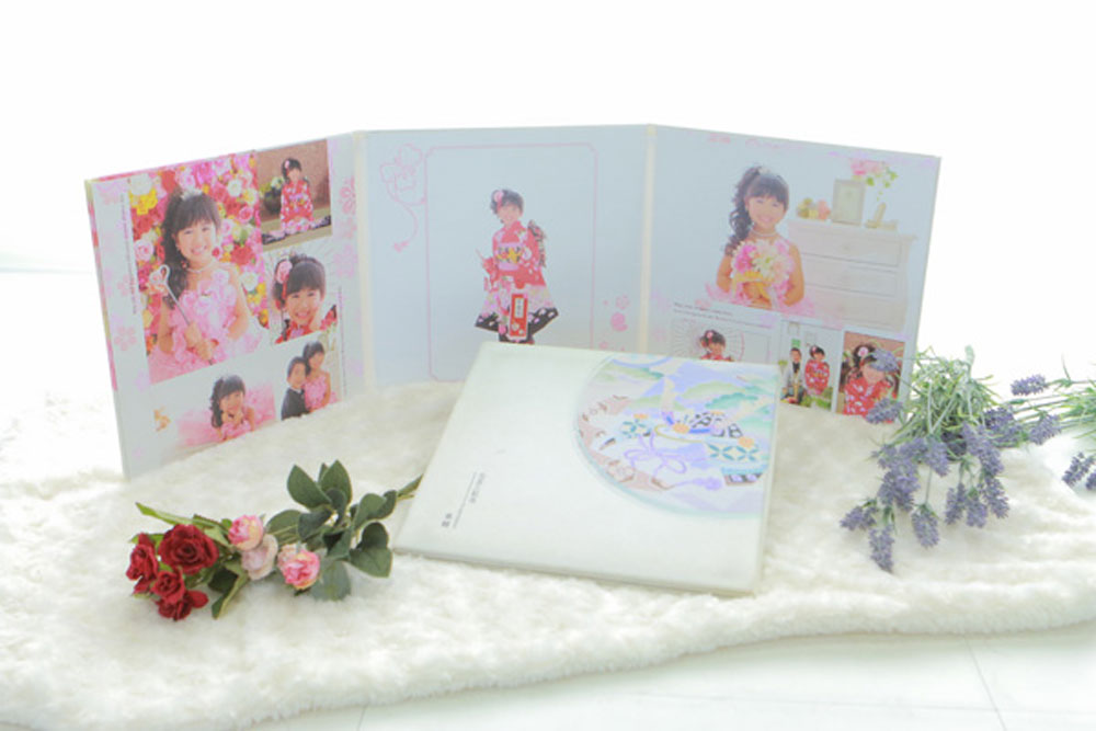 着た着物の柄が表紙に入る3面の飾れるアルバムです。