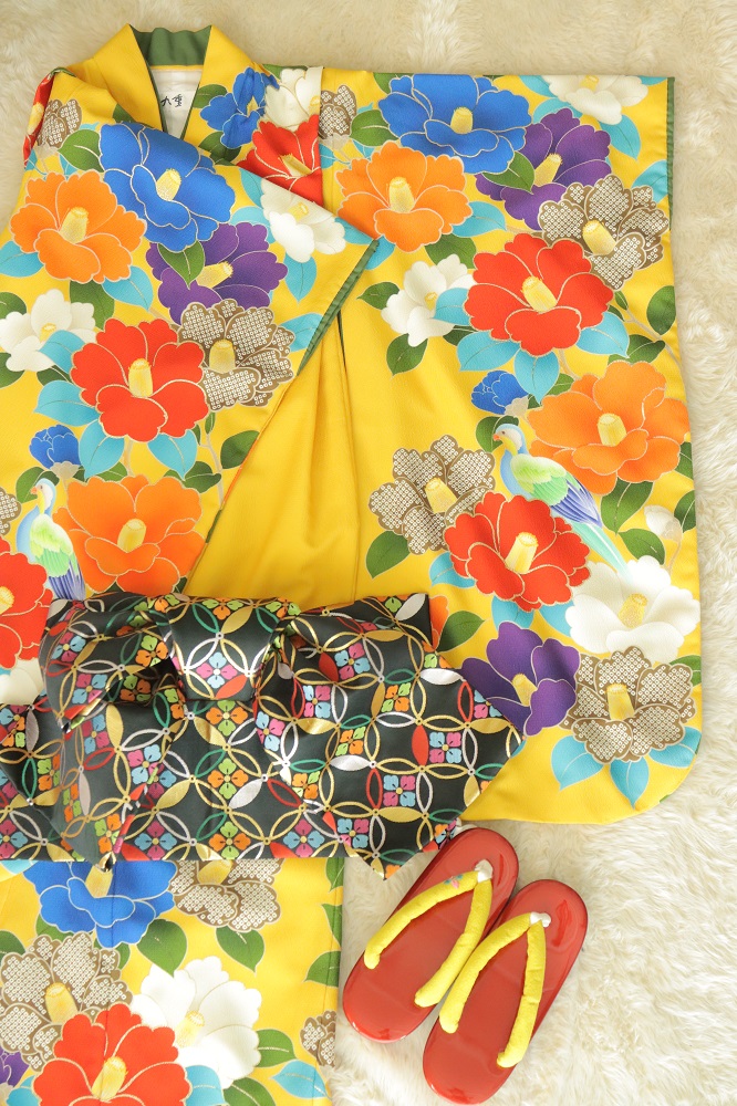七歳の着物は大人と同じつくりになっていて、大人っぽい衣装から華やかでカラフルな衣装までたくさんご用意がございます。