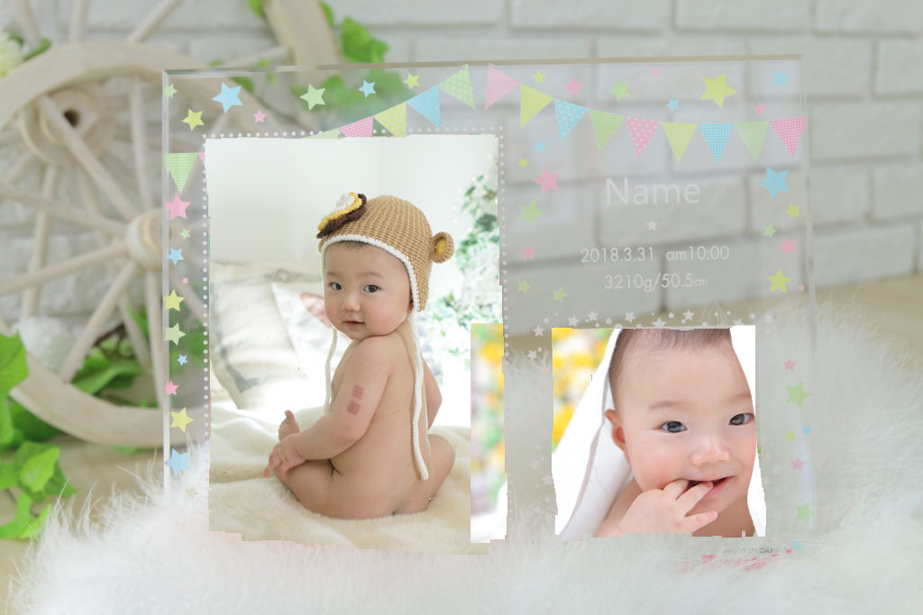 とっても人気のフレームです♪透明のアクリルにお写真が印刷されています。お名前や記念日を入れることが出来ます。アクリル素材は割れにくいので安心ですね♡コチラを目当てにご来店されるお客さまも多いです(*’▽’)この機会に是非手に入れてみてくださいね~♪
