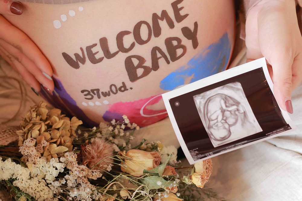 「お腹の中にいた頃のあなた」と「もうすぐ会えるあなた」を1枚の写真に残す感動的なショットです
