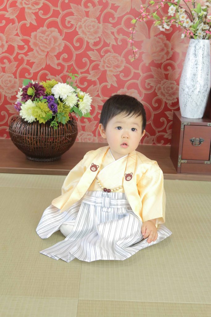 男の子に大人気!くまさんマークがポイントの黄色の羽織袴!