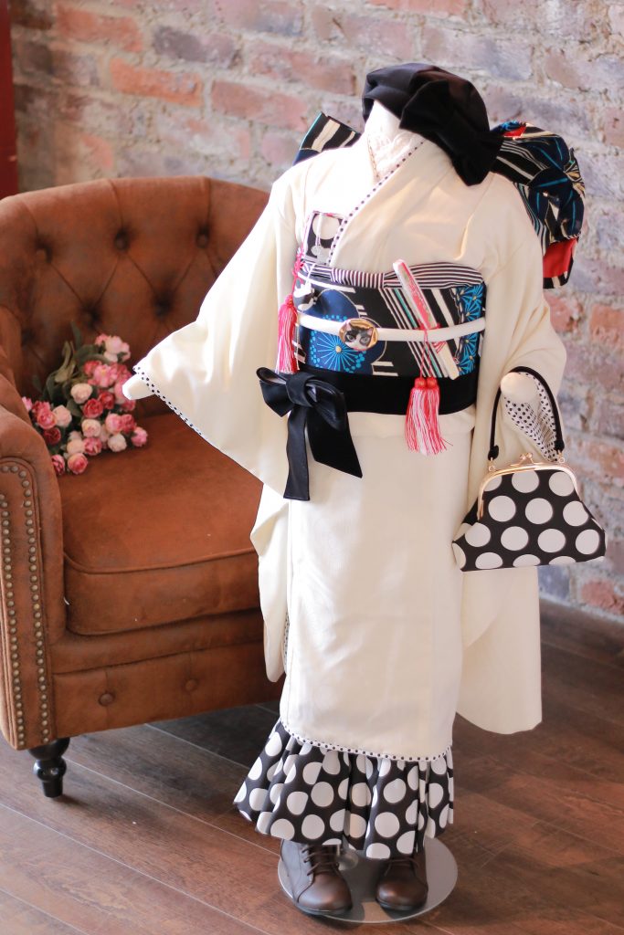 白の無地のお着物になんと下にスカートを履くイマドキな着物です!!もちろん、スカート無しでもOK!