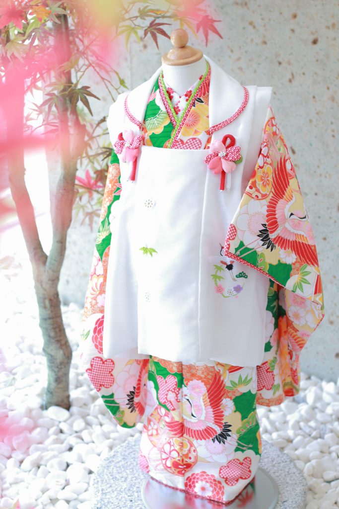 このお衣装は緑色のほかに、定番色の赤、大人っぽい黒、個性的な赤被布に紫のお着物、黄緑色の色違いがございます♪