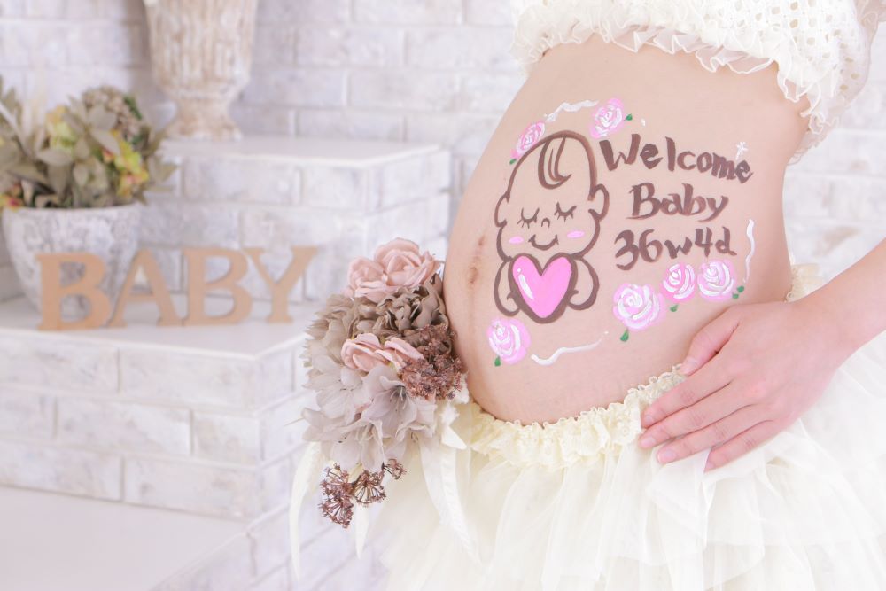 マタニティフォトではイベント日限定、通常4,400円するハーフベリーペイント(お腹のペイント)が無料!