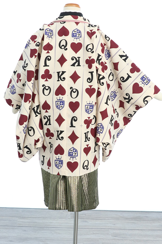 最後にこちらの個性的なお着物のご紹介です(‘ω’)ノ こちらのお着物は、羽織にトランプのスペードやハートなどのマークが描かれており、周のお子様と被りにくい衣装です!! また、中のお着物やその他の小物にも遊び心がある一着になっております♪ 5歳の衣装は「衣装コレクション」からも見ることが可能です!!