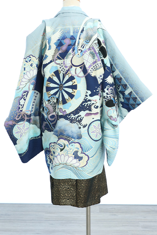 かっこいい青色のお着物の紹介です♪ お着物が濃い青色のお色味なので、お写真映え間違いなしです(*’ω’*) ご家族様からも評判の高いお着物です♪ 後ろの柄にも注目です♡