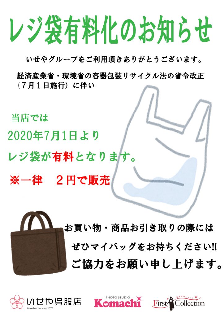 Tweet Share Pocket Pin it いつもいせやグループをご利用頂き、誠にありがとうございます。 2020年7月1日より、経済産業省・環境省の容器包装リサイクル法の省令改正に伴い、レジ袋を有料とさせて頂いております。 一律 2円で販売しております。 お買い物、商品のお引き取りの際にはぜひマイバッグをお持ちください。 ご協力をお願い申し上げます。 Tweet Share Pocket Pin it この記事のタイトルとURLをコピーする 七五三 五歳様ご紹介 鴻巣店 前の記事 ★深谷店人気サブツール★ 次の記事