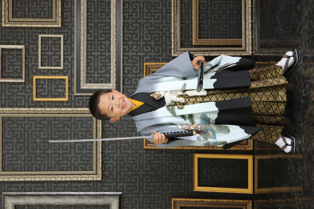 こちらは七五三の5歳様のお写真ですね!!!グレーと黒のとってもかっこいい祝着を着ています!!!!(^^)!