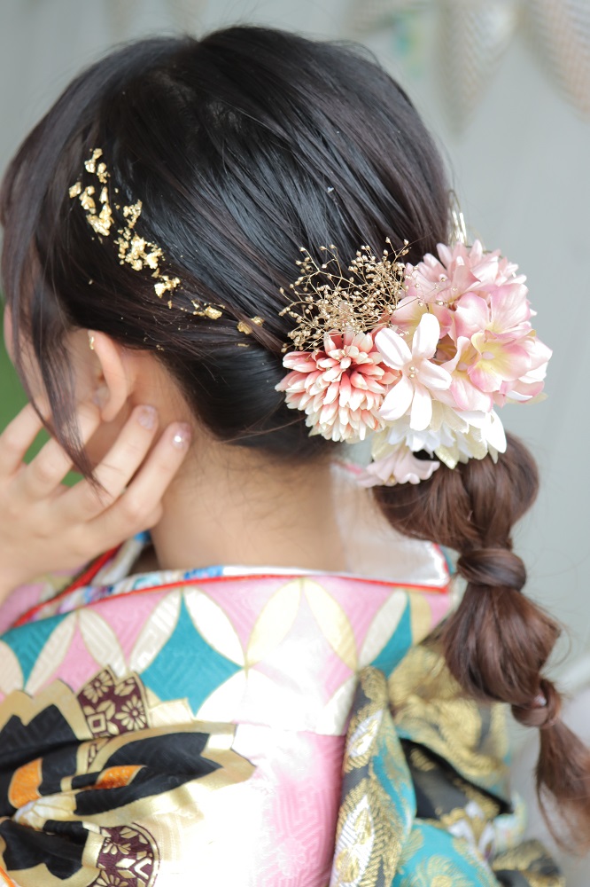 また、“組みひも” といわれるロープのような紐を髪の毛に巻きつける、存在感のあるヘアスタイルです。組みひものほかにも細い紐やリボンなど色みや種類が異なる紐を使って、自分のお振袖と合わせるのがポイントです♪