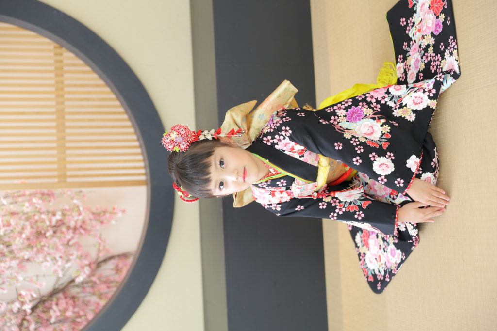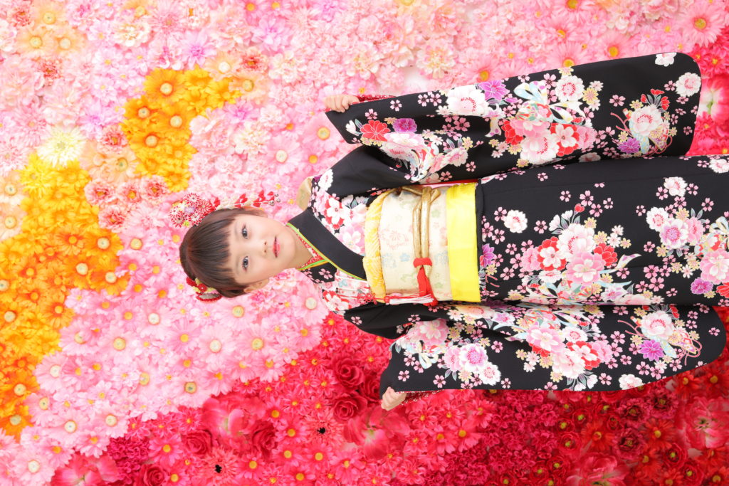 お花の背景の前でのお袖広げのポーズがかっこよく決まってますね!!!またピンクや赤色が多い背景なので黒いお着物がとっても映えますね!!!黒が地色のお着物は一見地味に見られがちですが、お着物の柄を引き立ててくれるので、実はとってもゴージャスなんですよ!!( ..)φメモメモ 七五三でお悩み中の方もぜひ一度試してみたくださいね!!!!(#^.^#)