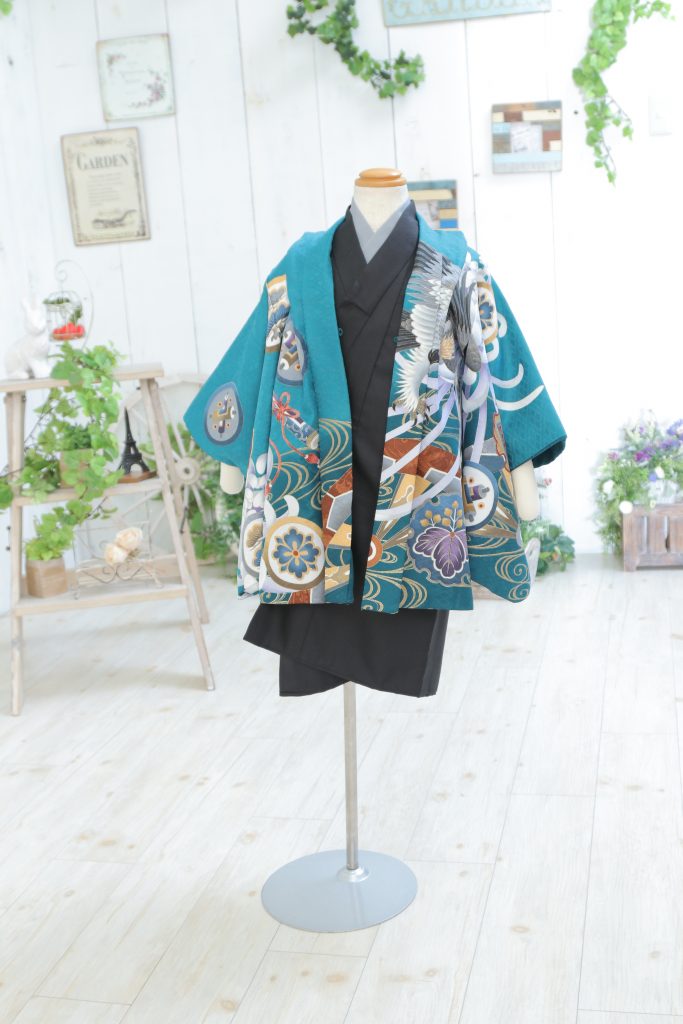 こちらはブルーグリーンの羽織に黒のお着物でカッコよくきまります!