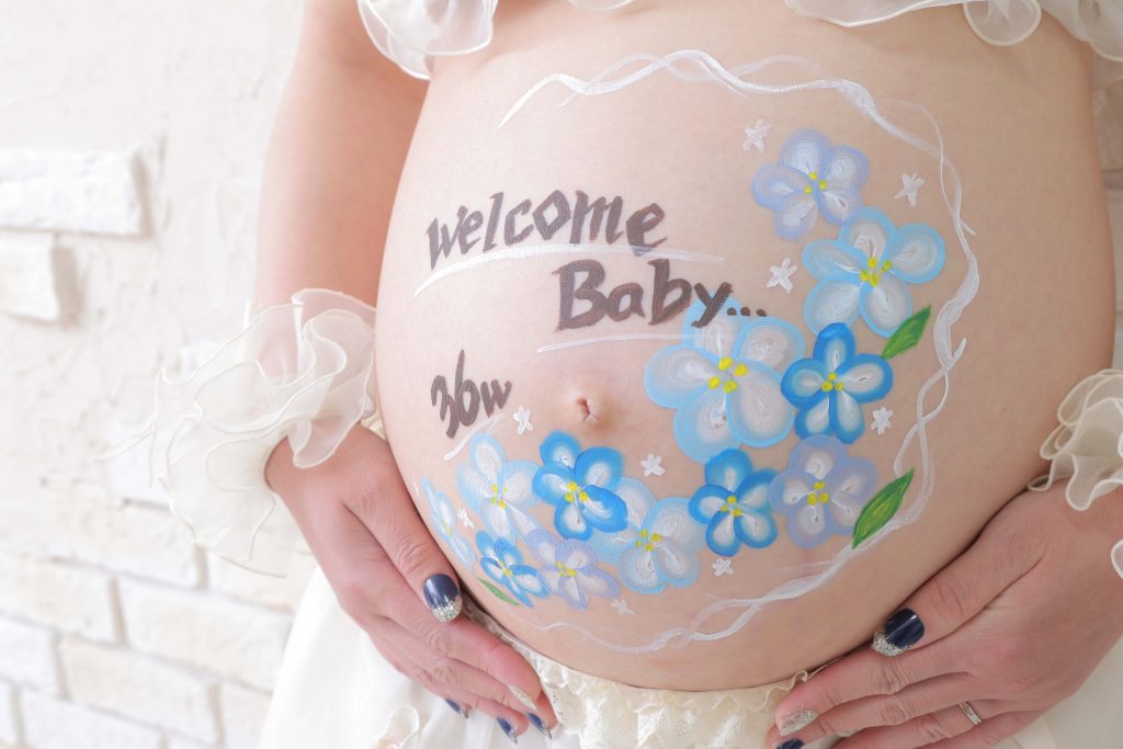 と安産祈願を込めて妊婦さんの大きなお腹に絵を描く新しい『おまじない』です♪