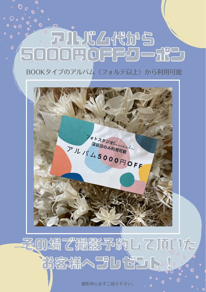 なんと…お写真選びの際に使えるアルバム代5000円OFFクーポンをプレゼントしちゃいます🎁♪